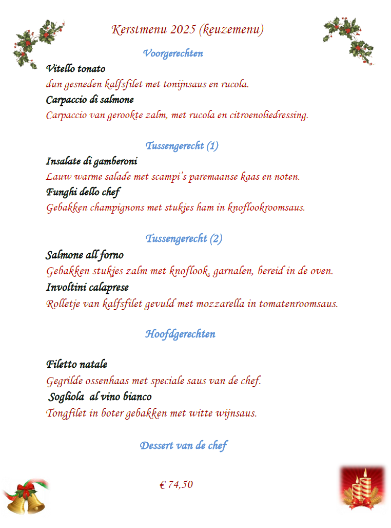 Wij zijn beide Kerstdagen geopend van 16:00 tot 22:00 uur. U kunt bij ons in het restaurant genieten van verse Italiaanse gerechten. Ook hebben we weer een overheerlijk Kerstmenu samengesteld, zoals u dat van La Riva gewend bent.